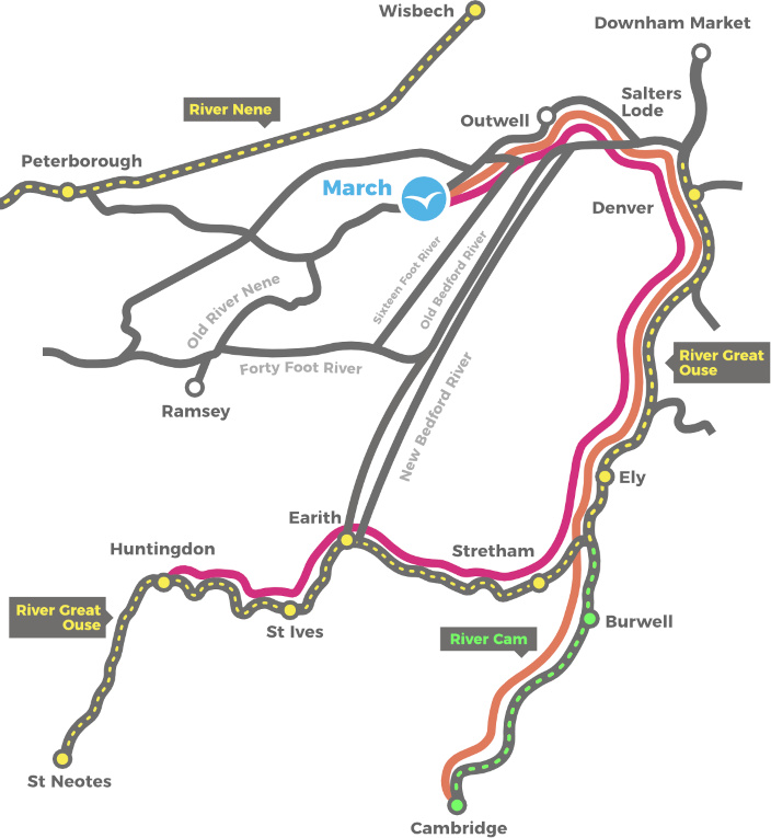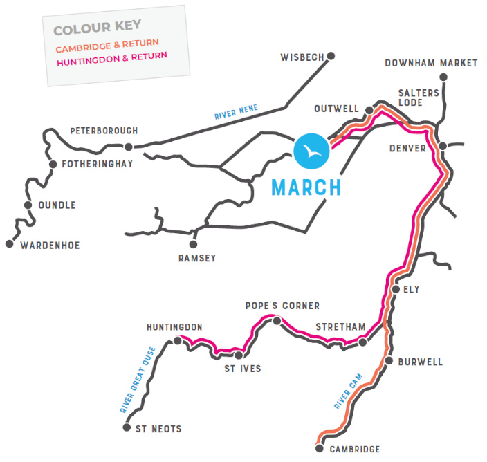 Hjemreisen går tilbake same ruten fra Huntingdon og tilbake til March, hvor det blir anledning til å slappe av på dekkene eller utforske mer langs veien, hvis du har tid.