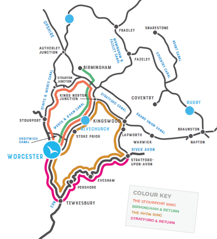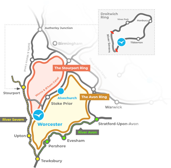 Droitwich Canal forbinder Worcester and Birmingham med River Severn ved Hawford, og skaper en ny mini-ring fra Worcester.