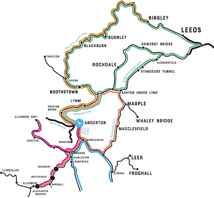 - Den sjeldne, roterende broen Barton Swing Aqueduct, som løfter en liten kanal over en større