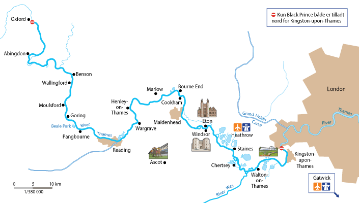 - Historiske engelske byer som Marlow, Cookham, Pangbourne og Datchet