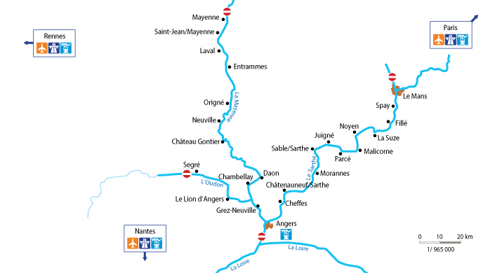 Fra basen i Grez-Neuville er elva kantet av små landsbyer, herskapshus og gamle møller, som nesten hviler opp i elvas skråninger. Stopp i Angers, Kong René sin by eller ved klosterkirken i Entrammes, der også de berømte Port Salut-ostene fremstilles. Kunstmuseet i byen Laval er også verdt et besøk.
